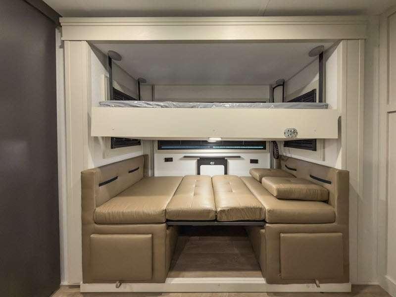 Sleeps 6 Slides 4 Length 34 ft 4 in Ext Width 8 ft 5 in Ext Height 13 ft 5 in Int Height 8 ft 1 in Exterior Color Standard Graphics or Aurora, Midnight, Pearl Full-Body Paint Options Hitch Weight 3200 lbs GVWR 23500 lbs Dry Weight 1900 lbs Fresh Water Capacity 83 gals Grey Water Capacity 159 gals Black Water Capacity 106 gals Tire Size ST215/75R 17.5 LRH Furnace BTU 35000 btu Number Of Bunks 2 Available Beds Queen Refrigerator Type Stainless Steel Refrigerator Size 20 cu ft Cooktop Burners 3 Shower Size 60" x 30" Number of Awnings 3 Axle Weight 8000 lbs LP Tank Capacity 30 lbs. Water Heater Type Tankless On Demand AC BTU 30000 btu TV Info LR LED 50" Smart TV, BR 40" TV, BNKRM 40" TV, EXT 50" TV Awning Info 15’ 5”, 7’ and 15’ 5" Power w/Integrated LED Lighting Axle Count 2 Number of LP Tanks 2 Shower Type Tub/Shower Combo Electrical Service 50 amp Similar Floorplans