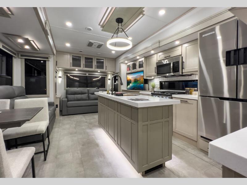 Each is built on a 101" wide body drop-frame super chassis, and includes the MORryde pin box system that utilizes a unique rubber shear spring to positively deal with rough towing and road shock. Some standard features that stand out include the chef-inspired professional grade stainless steel cooktop and Smart sink with a removeable cutting board, produce strainer and glass rinser, and the on-demand water heater with a whole house water filtration system. There is also an all-in-one enclosed and heated utility center to enjoy four seasons of camping, plus many more comforts.