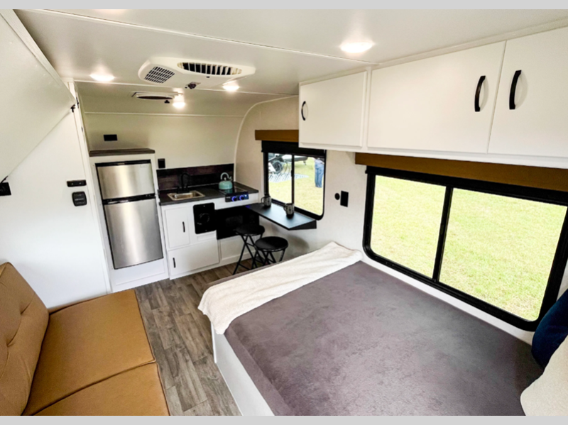 Sleeps 4 Length 16 ft 2 in Ext Width 8 ft Ext Height 9 ft 10 in Int Height 6 ft 6 in Dry Weight 2595 lbs Fresh Water Capacity 16 gals Grey Water Capacity 14.5 gals Black Water Capacity 22.5 gals Tire Size ST235/75R-15 All Terrain Furnace BTU 19000 btu Number Of Bunks 1 Available Beds Full Refrigerator Type 12V Two Door Refrigerator Size 4.5 cu ft Cooktop Burners 2 Number of Awnings 2 Water Heater Type Fogatti On Demand AC BTU 13500 btu Awning Info 7' 8" Rear, 10' Side Axle Count 1 Shower Type Wet/Bath Shower Similar Floorplans