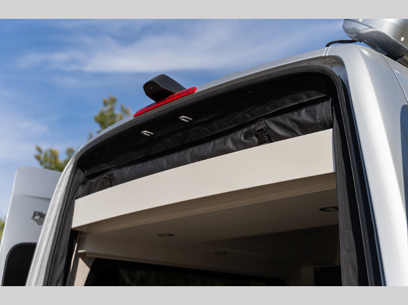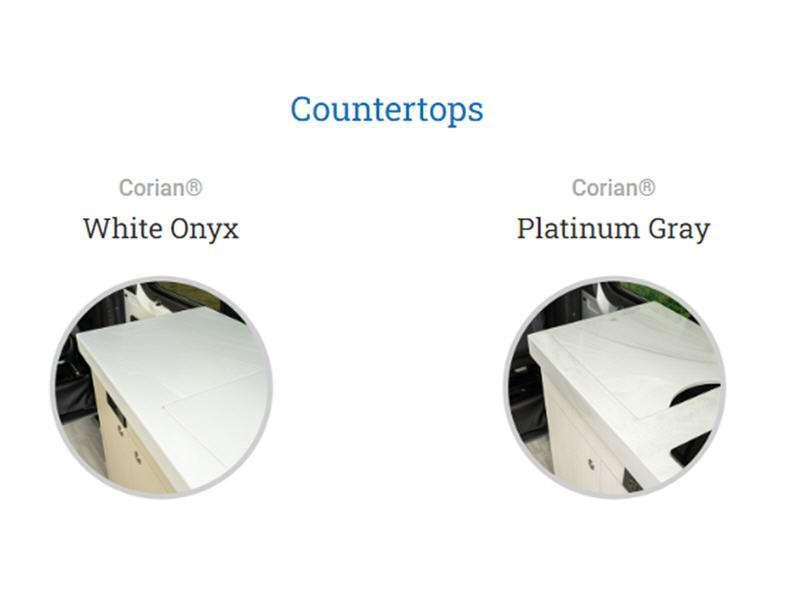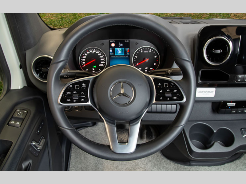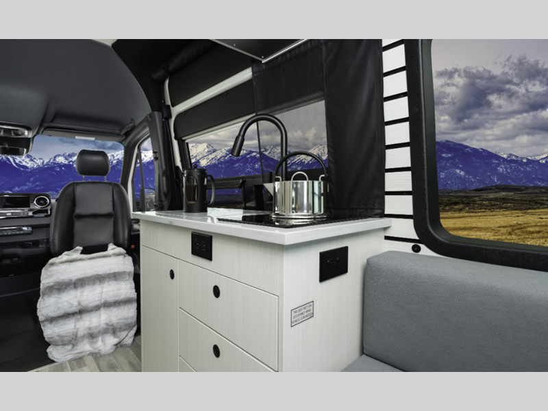 The galley has everything you need to prepare meals while you're on the road, including a one burner induction cooktop, a microwave oven, plus Corian solid surface countertops. The captain's seats are made with Mercedes-Benz leather and include four-way lumbar support, memory settings, and more for a truly comfortable ride. You can even freely explore and extend your off grid adventures with the Go Power! Solar package.