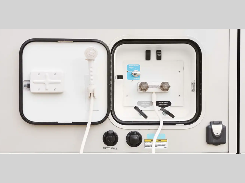 - Service center houses color-coded labels, pressurized city water hookup/tank diverter valve, drainage valves, exterior wash station w/lighted pump switch