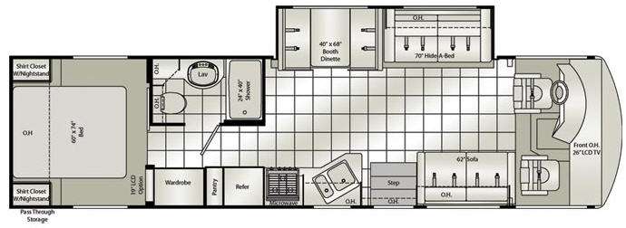 Solid wood raised panel cabinet doors Ball bearing drawer guides in kitchen Night shades in living area/bedroom Mini blinds in kitchen Mini blinds at bunks (35BD only) 100% nylon carpeting with stain treatment and pad in bedroom Linoleum in living area, kitchen and bathroom Faux Leather hide-a-bed sofa (drivers side) (n/a 3370) Driver side "Faux Leather" U-Dinette w/passenger side sofa (3370 Only) Booth dinette Queen mattress (innerspring) (n/a 3370) King innerspring mattress (3370 only) Bunk beds (35BD only) Cork board across from bunks (35BD only) Designer bedspread and shams